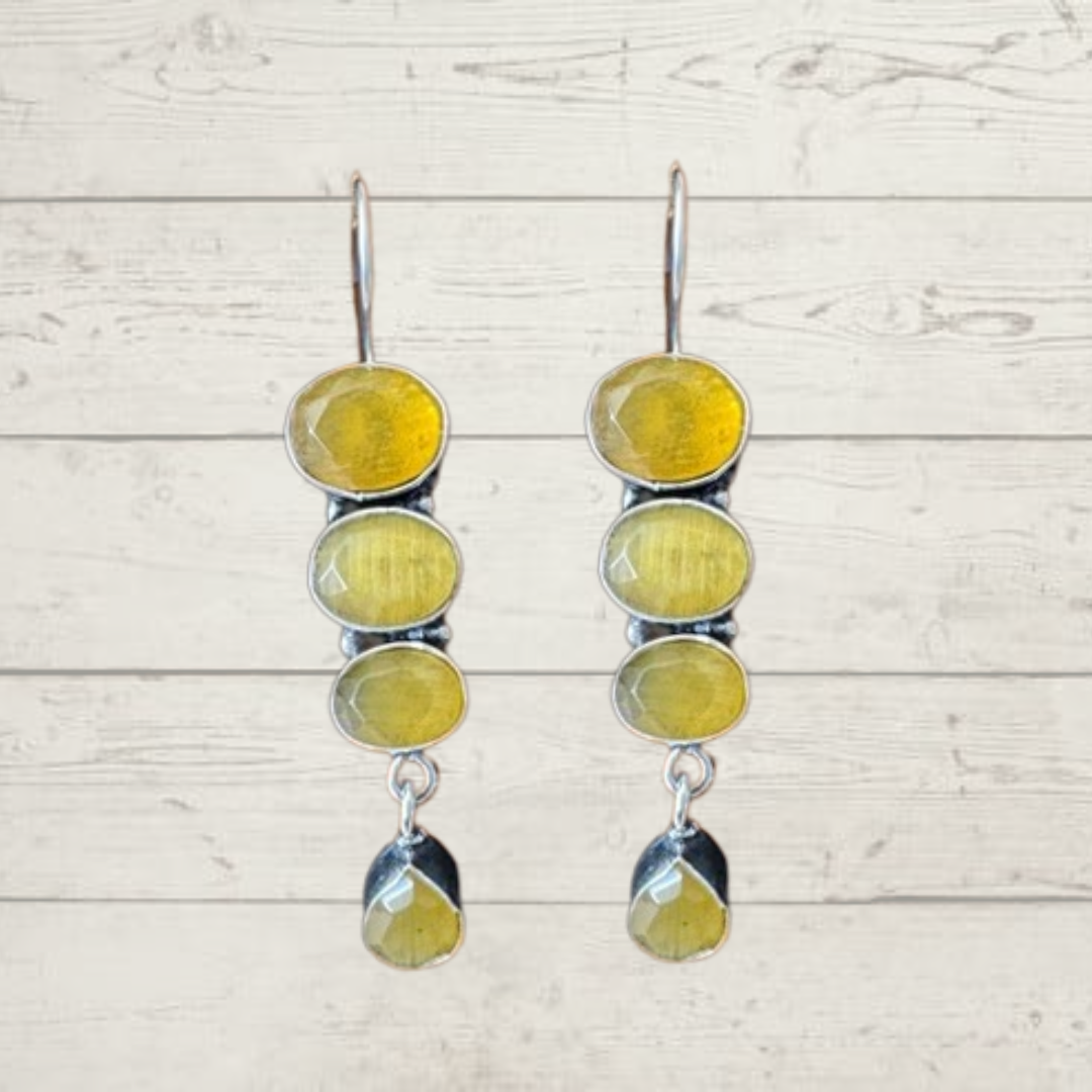 Enhance your style with these exquisite long earrings crafted from premium German silver. Featuring oxidized detailing and uncut oval stones, they are available in six stunning colors. Perfect for any occasion.