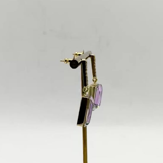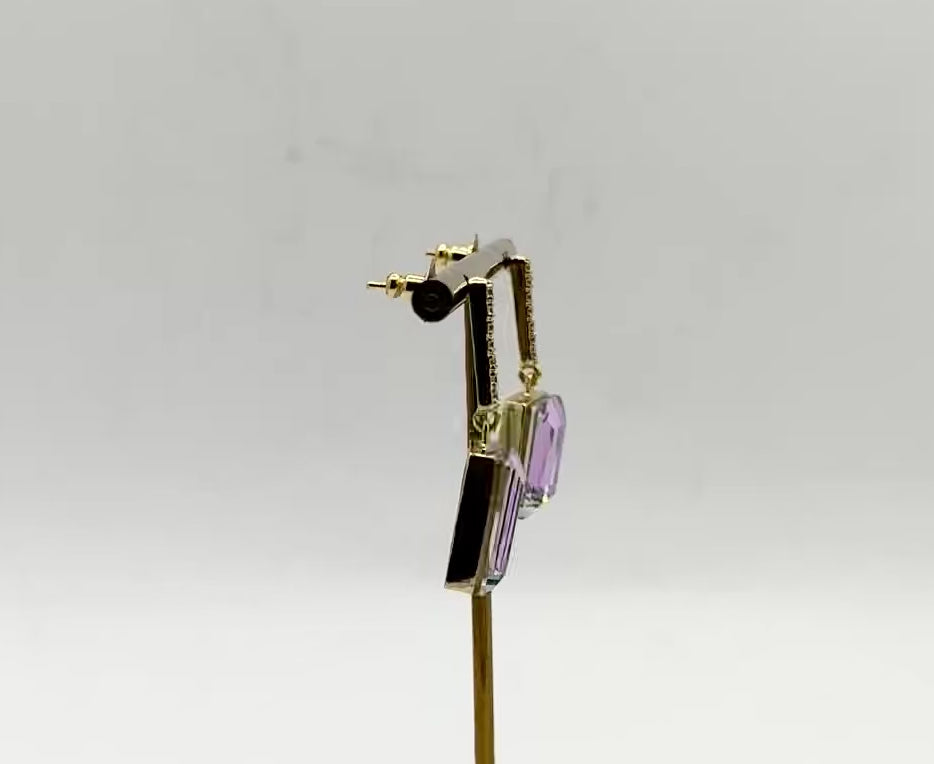 2-Stone Swarovski Crystal Elements Statement Square Shape CZ Drop Earrings in Light Amethyst & Light Gold Finish