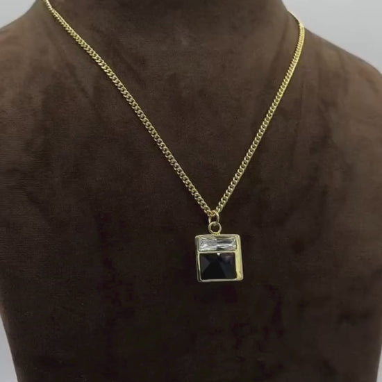 The Crystal Brass 2-Stone Pendant Necklace in Jet & Crystal with a light gold finish is a timeless piece that blends sophistication and bold elegance. Featuring two striking Swarovski crystals in jet and crystal hues, this pendant creates a beautiful contrast that sparkles with every movement. The light gold finish brass setting enhances the brilliance of the crystals, offering a warm and luxurious touch. The fine brass metal chain adds a delicate yet sturdy element to this exquisite design.Â