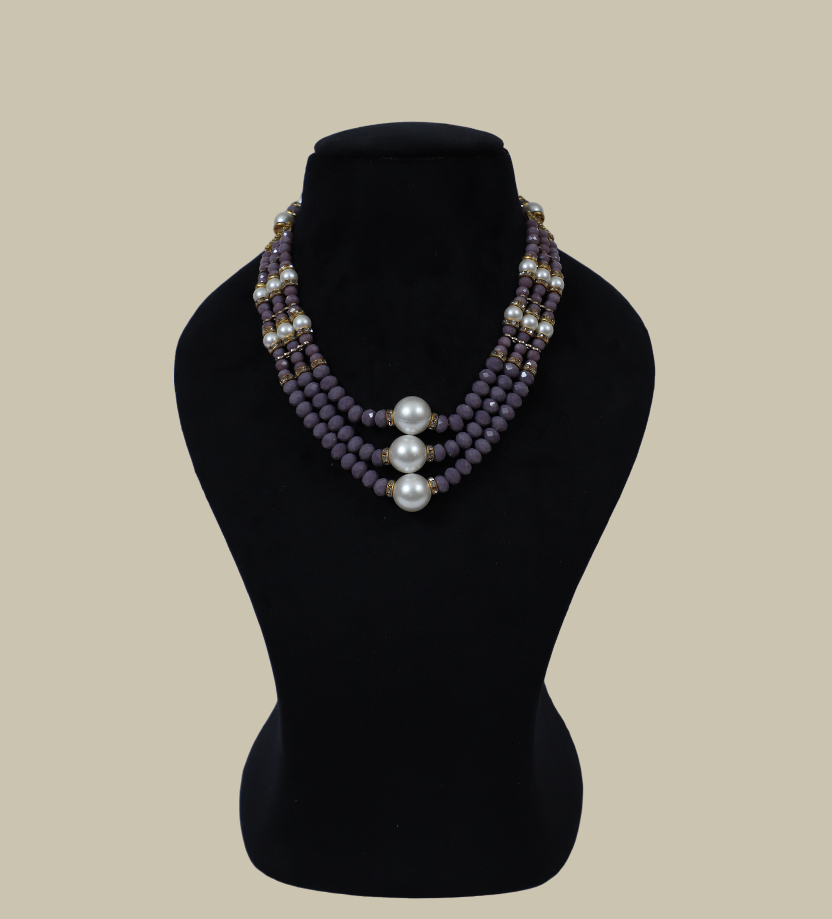Embrace sophistication with this 3-row necklace featuring glass, plastic, and pearl beads, adding a touch of elegance to your everyday style.