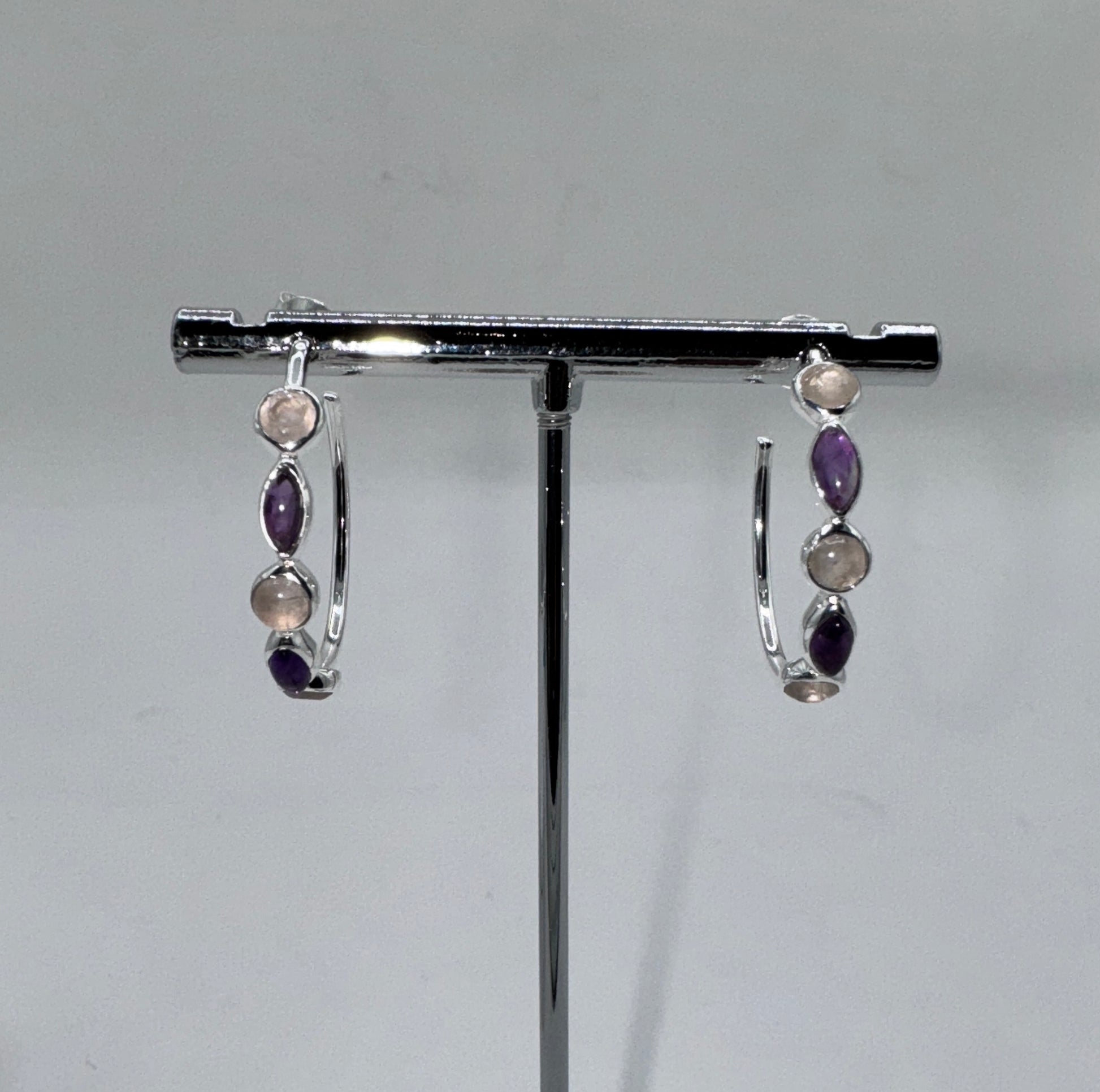 Sterling Silver Earrings with Amethyst, Rose Quartz, and Onyx